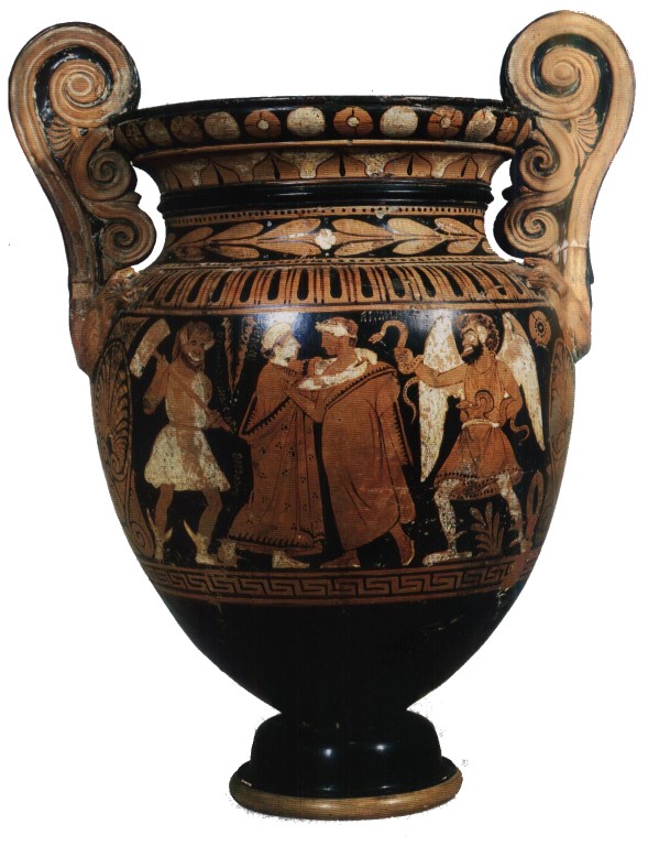 L’addio ad Admeto da parte di Alcesti. Stamnos a figure rosse di produzione vulcente. Il dio della morte Thanatos è qui rappresentato dai due Charun barbuti ed armati di martello |